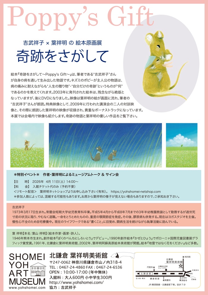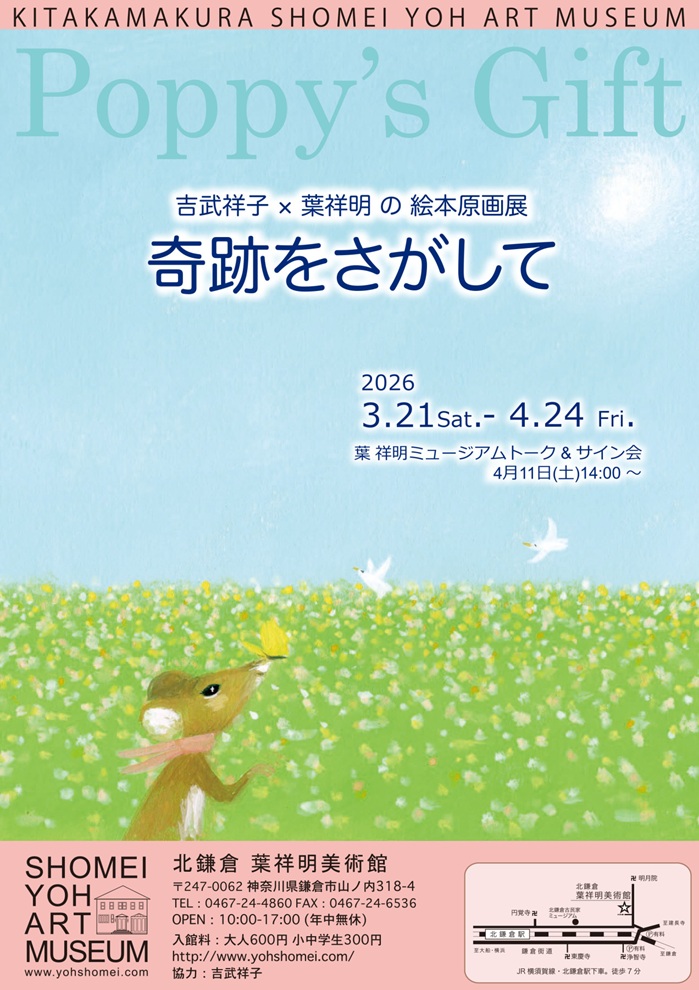 概要:本展は絵本『奇跡をさがして Poppy’s Gift』の原画を中心に吉武祥子と葉祥明による共同世界を紹介する展覧会である。病と向き合う中で生まれた物語をもとにネズミの少女ポピーの視点から人生の贈り物や奇跡の意味を問いかける作品が展開される。会場では原画に加え映像作品も上映され言葉と絵が響き合う体験が構成されている。優しい色彩と静かな詩情を持つ葉祥明の表現と作者自身の朗読による語りが重なり観る者の内面に深い余韻を残す内容となっている。